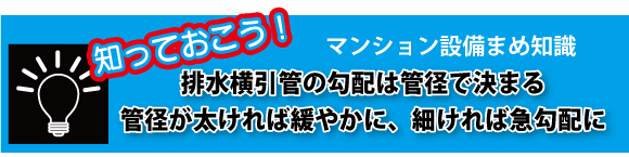 雑排水(台所、浴室等)と汚水(トイレ)の排水横引管では、汚水のほうが固形物を流すため、管径が太くなります。勾配を急にすると水だけが流れて汚物が残ってしまう心配があるためです。これにより勾配は緩やかになります。