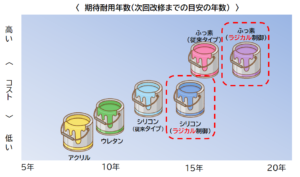 下塗り塗膜の性能を維持する役目を持つ上塗り塗料は、7年から8年ほど前まではアクリル樹脂、ウレタン樹脂、シリコン樹脂、フッ素樹脂と大きく分かれていました。