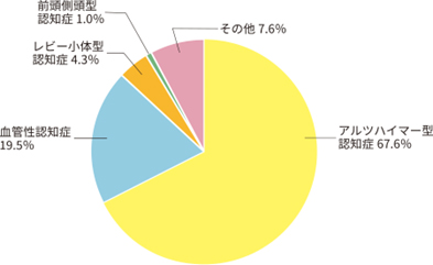 認知症にも様々な種類があります。厚生労働省の報告によると、アルツハイマー型の認知症というのが全体の67.6%、血管性認知症19.5%、レビー小体型認知症4.3%となっています。