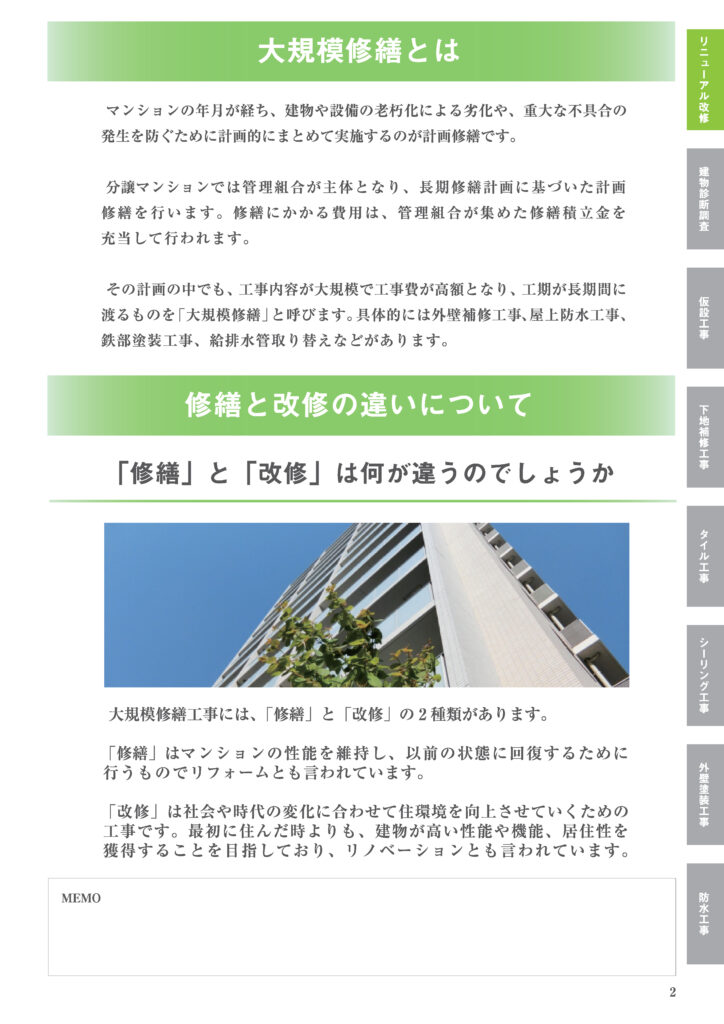 また、建材メーカーと協力して社内で作成した独自教材『大規模修繕の教科書』は、管理組合の理事会や修繕委員会での説明資料ほか、新入社員教育における講習会でも活用しています。新人がつまずきやすいポイントを丁寧に解説することで、業務への理解が深まり、安心して仕事に取り組める環境づくりに役立てています。