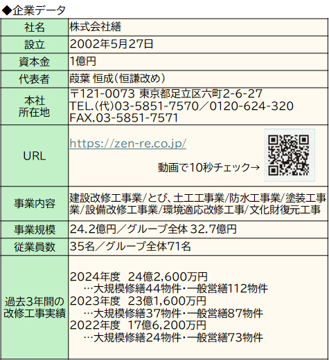 建設業界が深刻な人手不足と高齢化に直面している中、マンション大規模修繕工事を手がける全建センター会員工事会社・株式会社繕(本社東京・葭葉恒成〈よしば・つねのり〉社長)はこのほど、令和7年度東京都中小企業技能人材育成大賞知事賞の大賞を受賞しました。社員の人材育成・処遇改善に向けて、どのような取り組みをしているのか、葭葉社長にお話を聞きました。