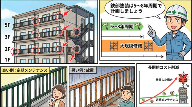 鉄部塗装は、大規模修繕工事とは別に、5~8年程度の短い周期で計画するのが適切です。これにより、建物の安全性を保ちつつ、長期的な修繕コストを抑えることができます。