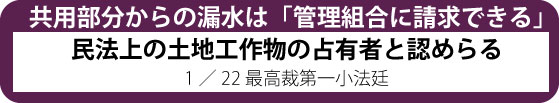 共用部分からの漏水により所有する専有部分に被害を受けた区分所有者が、管理組合を相手に賠償を請求できるかについて争った2件の訴訟で、「管理組合は占有者ではなく、賠償責任は負わない」とした東京高裁判断に対し、最高裁第一小法廷は1月22日、「管理組合が共用部分を支配、管理する義務」があり、民法717条の土地工作物の「占有者であると認めれらる」という判断を下しました。共用部分からの漏水は「管理組合に請求できる」とされたわけです。