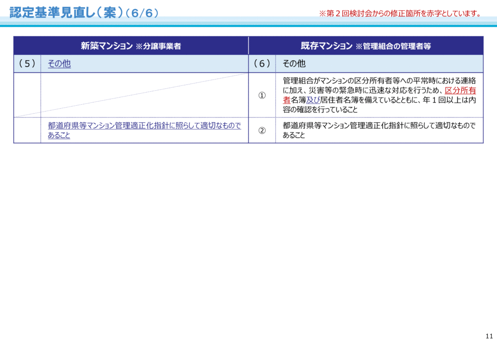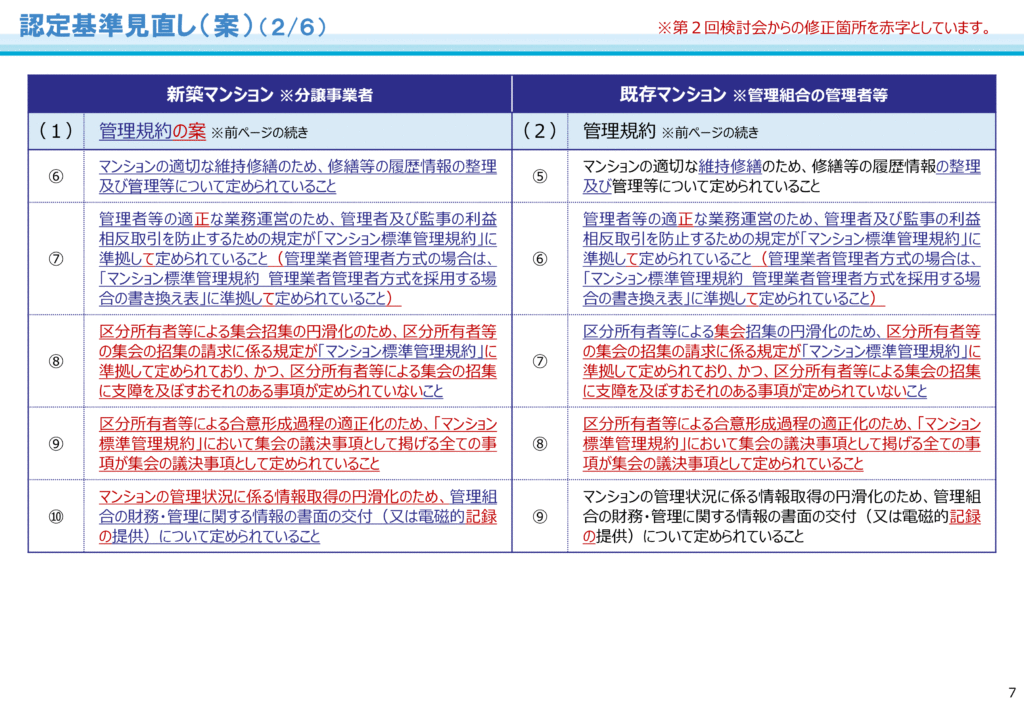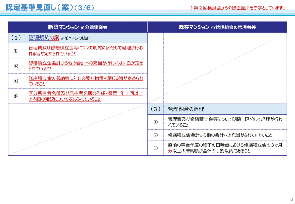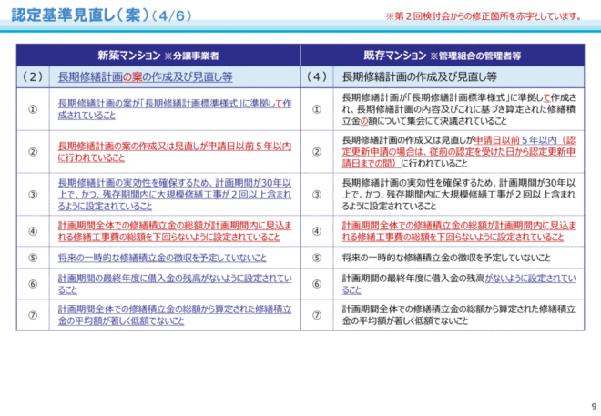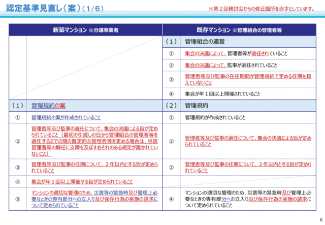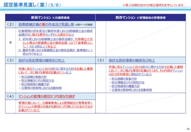 国土交通省は2月10日、マンション管理計画認定基準の見直し等に関する検討会(座長:齊藤広子・横浜市立大学教授)の第3回会合を開き、新築マンション、既存マンションにおける基準の見直し案が提示されました。第2回検討会からの修正部分は赤字になっています。