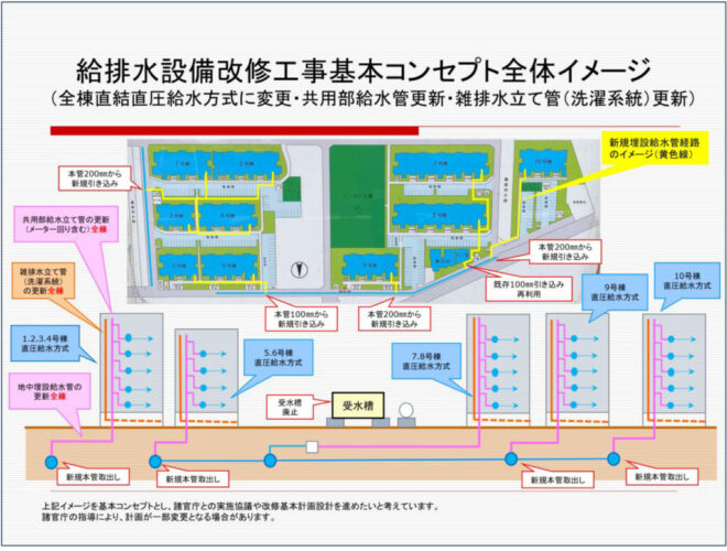 10棟300戸の共用部分給水管更新工事、給水方式の変更、洗濯排水系統の更新工事は、2023年2月1日から11月26日の予定で着工されました。