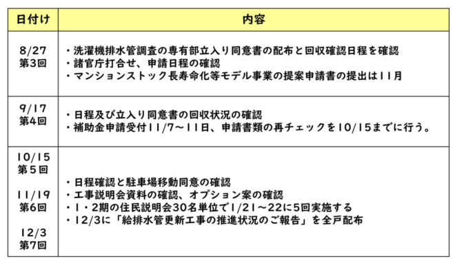 チームの活動としては、洗濯機、排水管調査の専有部立入同意書の配付と回収確認日程を確定、それと所管庁の打ち合わせ、申請日程の確認、駐車場移動の同意の確認、工事説明会仕様の確認、オプション案の確認など。12月には 「給排水管更新工事の推進状況のご報告」を全戸配布するなど、チームで活動を行っていきました。
