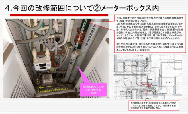 今、給水管だけ更新しても、近い将来、そのすぐ後ろにある排水立て管も更新しなくてはなりません。必要なら“道連れ工事”として、一緒に改修しておこうということで、この共用部分の排水立て管の洗濯系統を一緒に改修工事をして、将来の合理化を図るということを行いました。