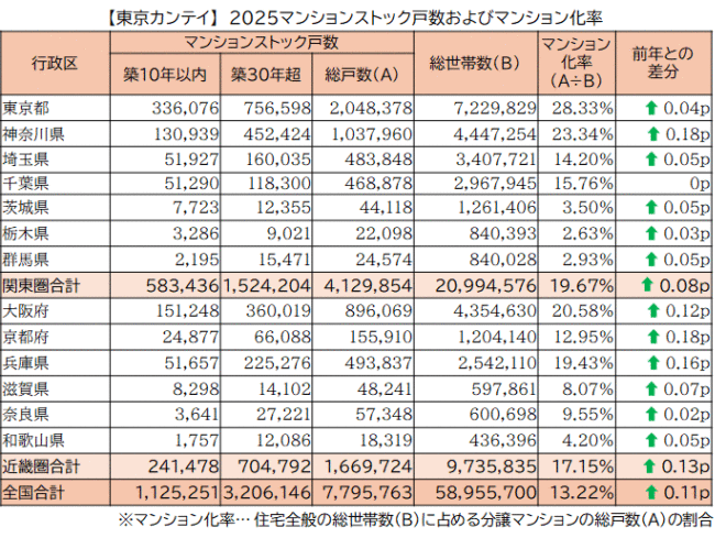 不動産データバンクの㈱東京カンテイは1月30日、「都道府県・主要都市のマンションストック戸数&マンション化率2025」を発表しました。