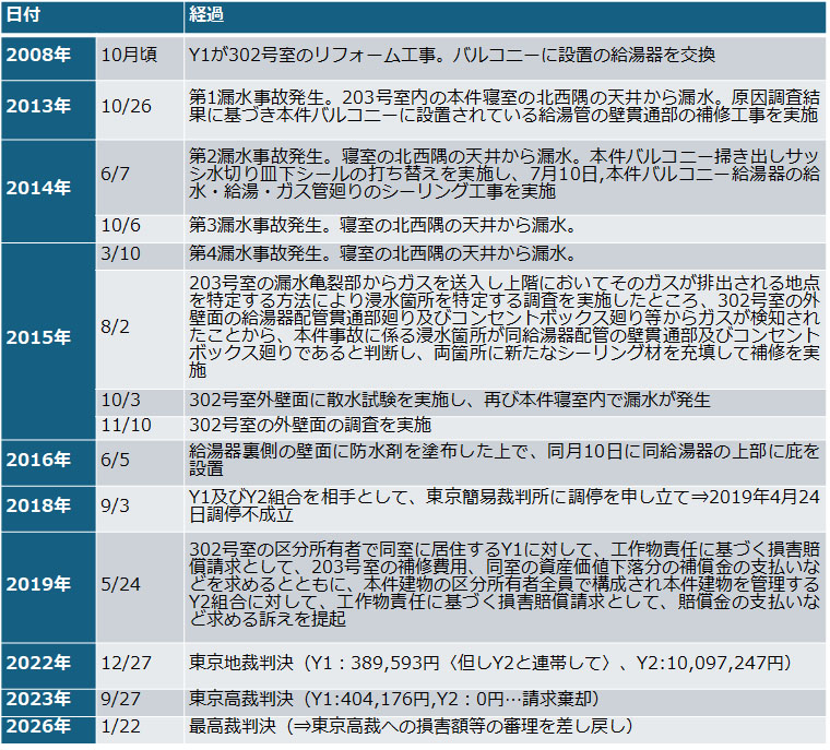共用部分からの漏水により所有する専有部分に被害を受けた区分所有者が、管理組合を相手に賠償を請求できるかについて争った2件の訴訟で、最高裁は「管理組合は土地工作物の占有者にあたる」と認定しました。これにより、区分所有者は管理組合に対して損害賠償を請求できることが確定しました。