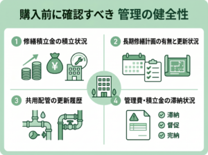 マンション購入の際は、価格・立地・間取りと同じくらい、以下の「管理の健全性」を確認することが不可欠だ。