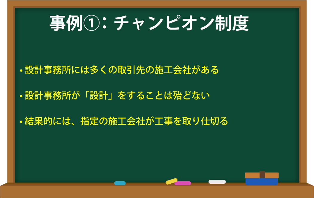 これを業界では「チャンピオン制度」と言っていまして、あたかも設計事務所が設計をしていると見せかけて、実際には指定の施工会社が行って、見かけ上の入札をして、落札をするという仕組みです。