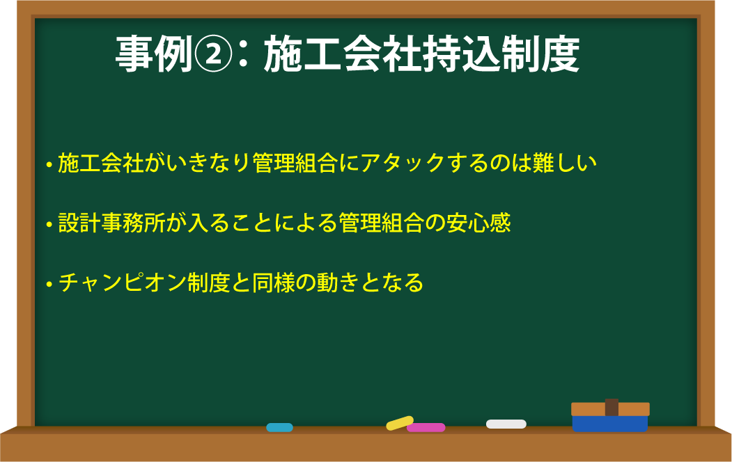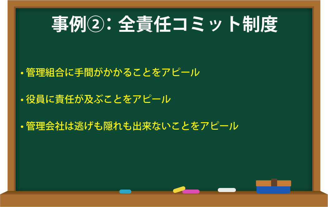 例えば、大きな工事を行う場合、何かあったときの責任は「そのときの役員さんが負ってしまいますよ」というように、危機感をあおります。「でも、管理会社にお任せいただければ、フロントマン、管理員がすべてフォローします よ」と、管理会社がコミットをした形で仕事を取りに来るケースをこう呼んでいます。