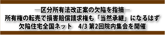 区分所有権が転売されれば、損害賠償請求権も当然に一緒に移っていくこと(当然承継)になるはずです。欠陥住宅被害全国ネットおよび全管連では、この「当然承継」があるべきだと訴えています。