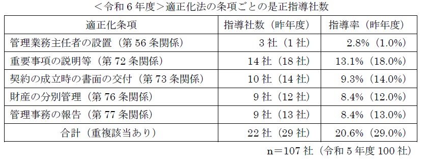 今回の立ち入り検査は、マンション管理業者の登録数1,776社(令和6年度末現在)のうち107社(昨年度100社)に対して実施。是正指導した合計(重複該当あり)の割合は20.6%で、昨年度(29.0%)との比較では8.4ポイント減、過去5年間の平均(29.1%)との比較では8.5ポイント下回りました。