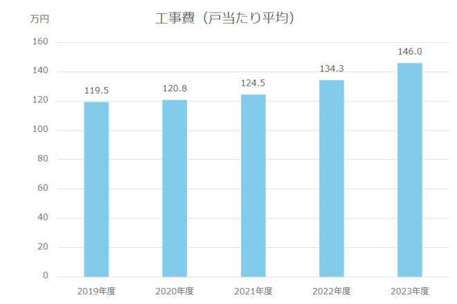 2019年度の119.5万円から5年で約22%アップしており、工事費高騰の影響が見られています。