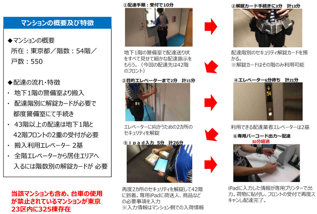 確かにセキュリティレベルの高いマンションでは、配達員が警備室で配達指示を得てセキュリティ施錠カードを預かり、何カ所かのセキュリティを解錠して居住エリアに入る仕組みがあり、一住戸への配達だけで30分かかるとする報告が上がっている。