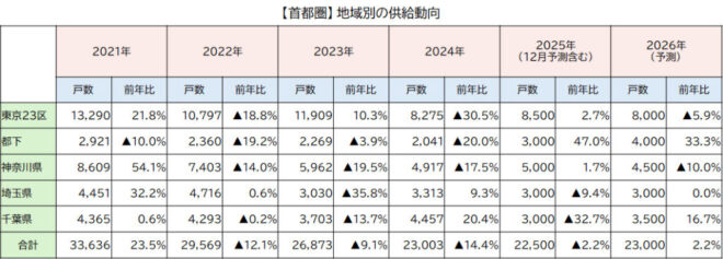 In the Tokyo region, 16,494 units are expected to be supplied from January to November 2025, adding to the December forecast of approximately 6,000 units for a total supply of approximately 22,500 units. This is expected to increase by 500 units (2.2%) to 23,000 units in 2026.