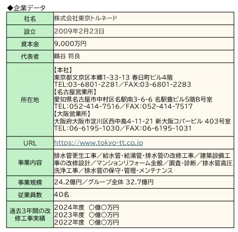 In older apartment buildings over 35 years old, management associations often conduct surveys and diagnoses to determine the lifespan of aging pipes due to leaks and other issues. As a result, when it comes to renovations, the choice between renewal and rehabilitation is considered, but there are cases where renewal is difficult, such as when pipes are embedded in the building's structure. We spoke with Masayoshi Tsurutani, president of Tokyo Tornado Co., Ltd., a water supply and drainage pipe rehabilitation specialist with a track record of over 990 projects and 73,800 households, about his company's efforts in drainage pipe rehabilitation work.